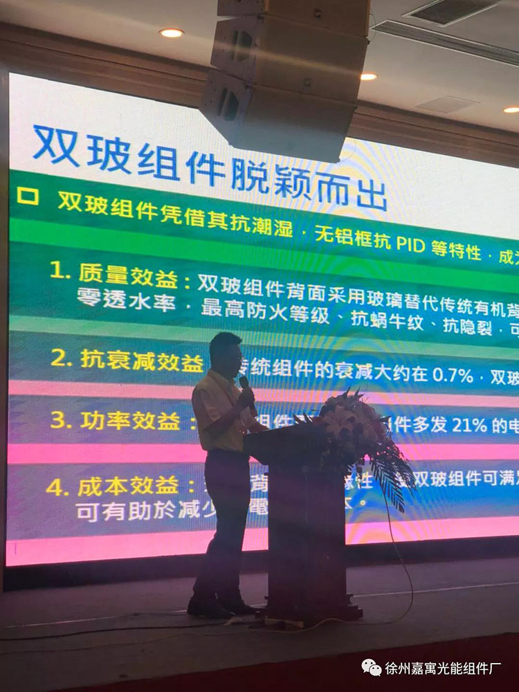 徐州嘉寓光能執(zhí)行副總何植業(yè)在水面光伏電站雙玻組件技術(shù)的突破和應(yīng)用方面和在座嘉賓進(jìn)行了分享和探討。