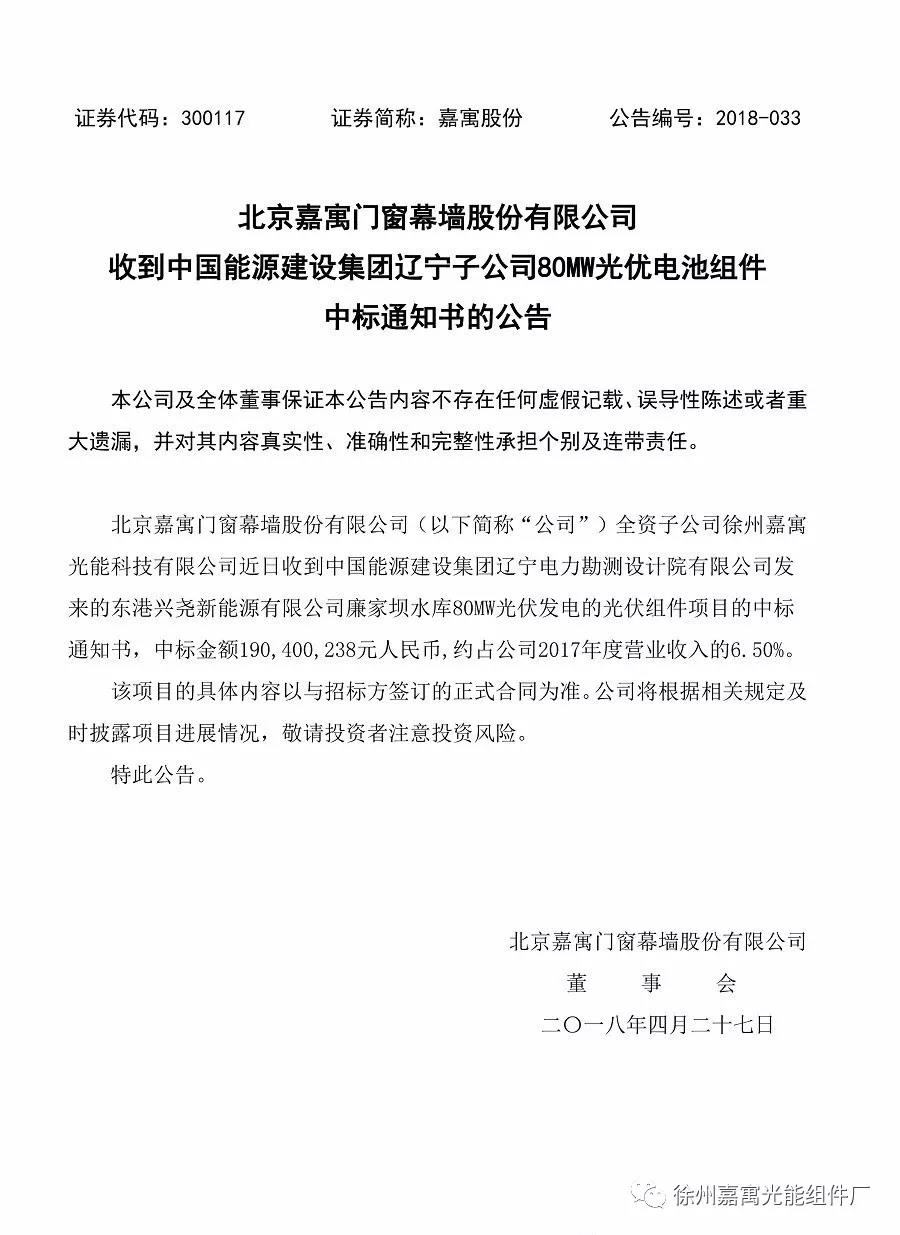 徐州嘉寓光能組件廠中標(biāo)中國能源建設(shè)集團(tuán)遼寧電力勘測設(shè)計(jì)院有限公司東港興堯新能源有限公司廉家壩水庫80MW光伏發(fā)電光伏組件項(xiàng)目