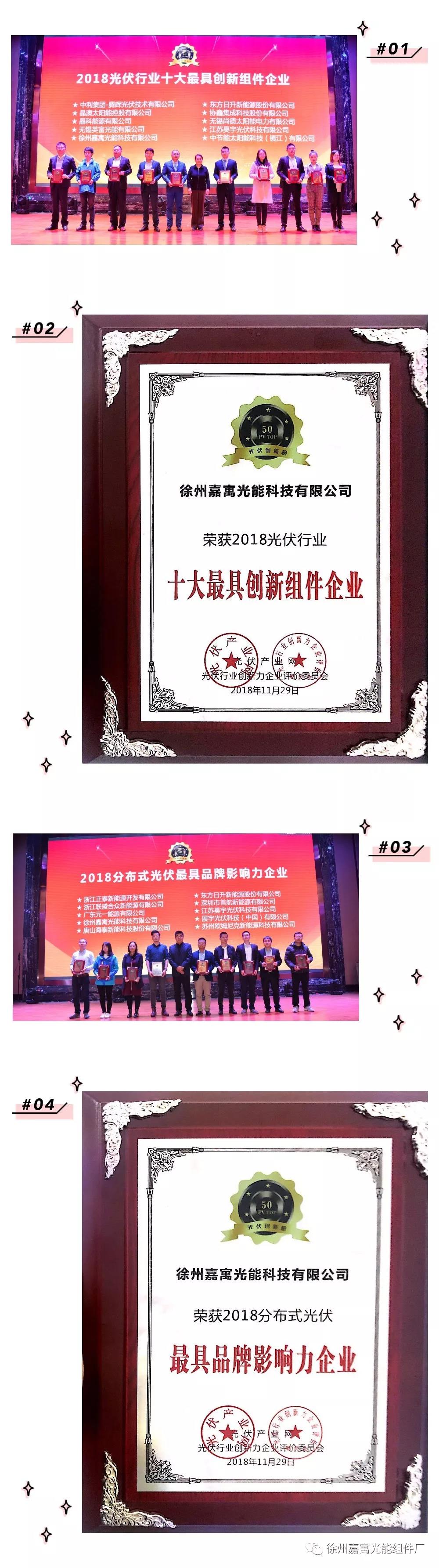 徐州嘉寓光能受邀參加此次盛典,憑借技術的創(chuàng)新以及高效的產品,再次斬獲“2018光伏行業(yè)十大最具創(chuàng)新組件企業(yè)” 以及“2018最具品牌影響力企業(yè)”兩項大獎。