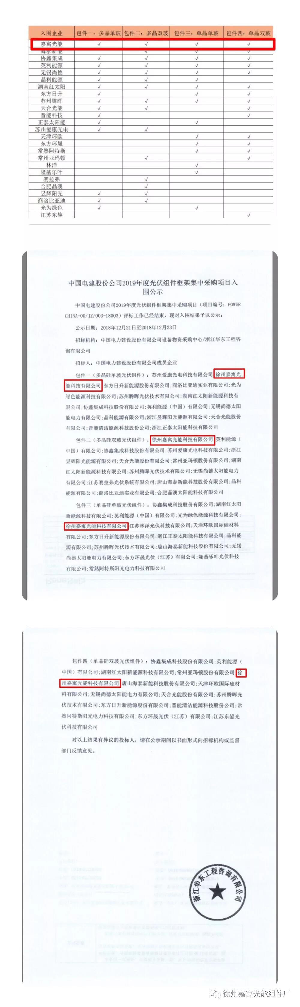 今日,中國電建股份公司公示了2019年度1GW光伏組件框架集中采購項目的入圍結(jié)果,徐州嘉寓光能的多晶單玻光伏組件、多晶雙玻光伏組件、單晶單玻光伏組件、單晶雙玻光伏組件四個標段全部入圍。