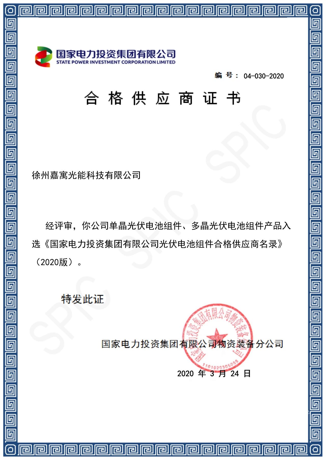 暮春四月,春暖花開(kāi),嘉寓光能頻傳佳音:徐州嘉寓光能成功入選國(guó)家電力投資集團(tuán)有限公司光伏電池組件合格供應(yīng)商名錄。