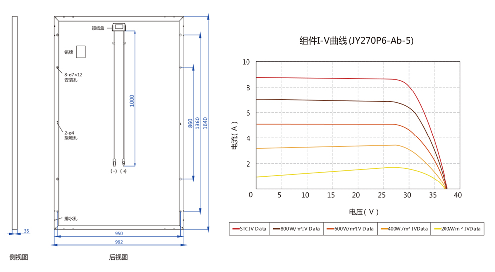 標(biāo)準(zhǔn)測(cè)試條件:大氣質(zhì)量AM1.5,輻照度1000W/ ㎡,電池溫度25℃. |